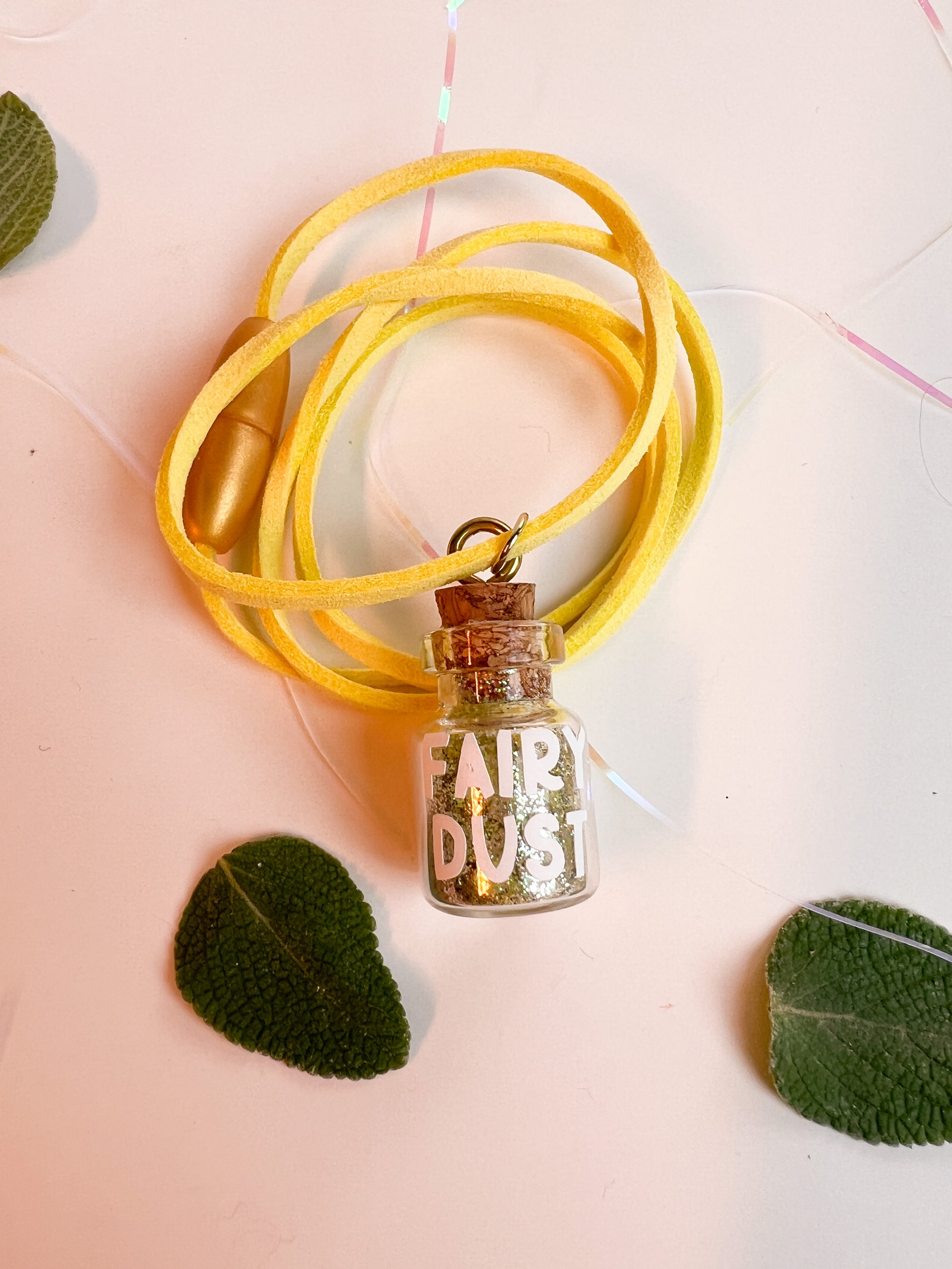 Each Fairy dust is on a 13'' faux suede cord with a child safety snap closure. Fairy dust is housed in a 1" glass bottle with a cork. Cork has been fixed to the bottle & sealed closed.